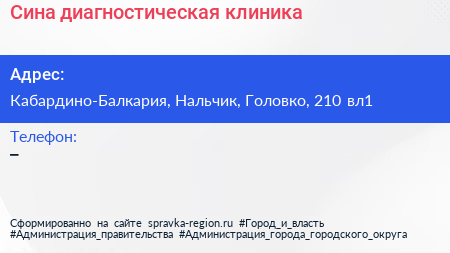 Сина, диагностическая клиника по адресу Кабардино-Балкария, Нальчик, Головко, 210 вл1 в дальнейшем Организация, размещена в следующих категориях: