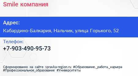 Smile, компания по адресу Кабардино-Балкария, Нальчик, улица Горького, 52 в дальнейшем Организация, размещена в следующих категориях: