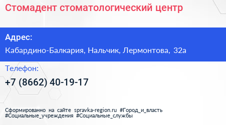 Стомадент, стоматологический центр по адресу Кабардино-Балкария, Нальчик, Лермонтова, 32а в дальнейшем Организация, размещена в следующих категориях: