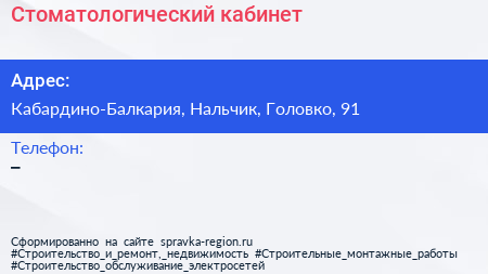Стоматологический кабинет по адресу Кабардино-Балкария, Нальчик, Головко, 91 в дальнейшем Организация, размещена в следующих категориях: