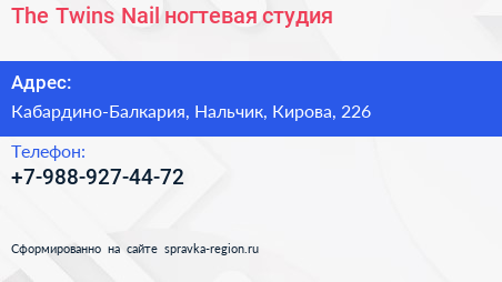 The Twins Nail, ногтевая студия по адресу Кабардино-Балкария, Нальчик, Кирова, 226 в дальнейшем Организация, размещена в следующих категориях: