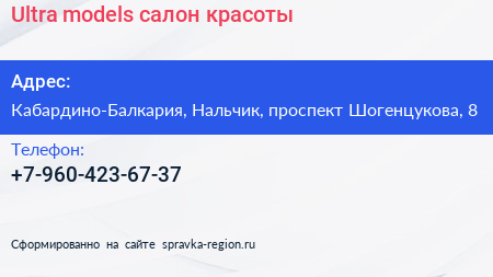 Ultra models, салон красоты по адресу Кабардино-Балкария, Нальчик, проспект Шогенцукова, 8 в дальнейшем Организация, размещена в следующих категориях: