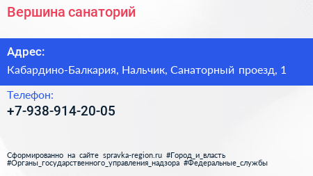 Вершина, санаторий по адресу Кабардино-Балкария, Нальчик, Санаторный проезд, 1 в дальнейшем Организация, размещена в следующих категориях: