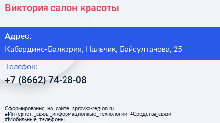Виктория, салон красоты по адресу Кабардино-Балкария, Нальчик, Байсултанова, 25 в дальнейшем Организация, размещена в следующих категориях: