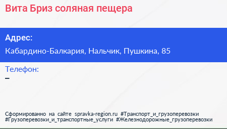 Вита Бриз, соляная пещера по адресу Кабардино-Балкария, Нальчик, Пушкина, 85 в дальнейшем Организация, размещена в следующих категориях: