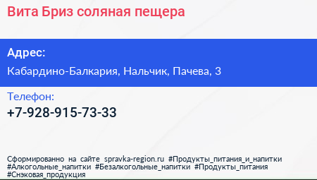 Вита Бриз, соляная пещера по адресу Кабардино-Балкария, Нальчик, Пачева, 3 в дальнейшем Организация, размещена в следующих категориях: