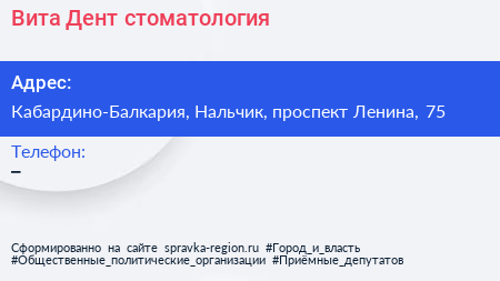Вита-Дент, стоматология по адресу Кабардино-Балкария, Нальчик, проспект Ленина, 75 в дальнейшем Организация, размещена в следующих категориях: