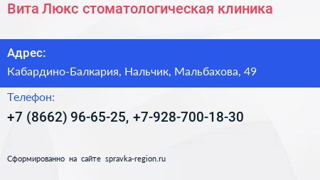 Вита Люкс, стоматологическая клиника по адресу Кабардино-Балкария, Нальчик, Мальбахова, 49 в дальнейшем Организация, размещена в следующих категориях: