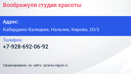 Воображуля, студия красоты по адресу Кабардино-Балкария, Нальчик, Кирова, 10/1 в дальнейшем Организация, размещена в следующих категориях: