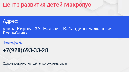 Центр развития детей Макропус по адресу улица Кирова, 3А, Нальчик, Кабардино-Балкарская Республика в дальнейшем Организация, размещена в следующих категориях: