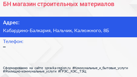 БН, магазин строительных материалов по адресу Кабардино-Балкария, Нальчик, Калюжного, 8Б в дальнейшем Организация, размещена в следующих категориях: