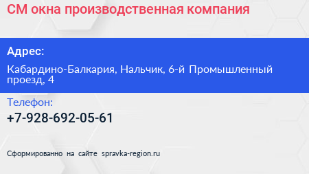 CM-окна, производственная компания по адресу Кабардино-Балкария, Нальчик, 6-й Промышленный проезд, 4 в дальнейшем Организация, размещена в следующих категориях: