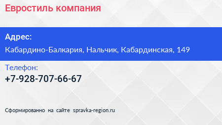Евростиль, компания по адресу Кабардино-Балкария, Нальчик, Кабардинская, 149 в дальнейшем Организация, размещена в следующих категориях: