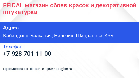 FEIDAL, магазин обоев, красок и декоративной штукатурки по адресу Кабардино-Балкария, Нальчик, Шарданова, 46Б в дальнейшем Организация, размещена в следующих категориях: