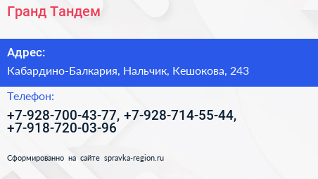 Гранд-Тандем по адресу Кабардино-Балкария, Нальчик, Кешокова, 243 в дальнейшем Организация, размещена в следующих категориях: