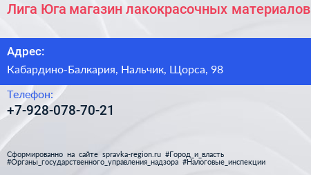Лига Юга, магазин лакокрасочных материалов по адресу Кабардино-Балкария, Нальчик, Щорса, 98 в дальнейшем Организация, размещена в следующих категориях: