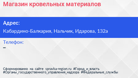 Магазин кровельных материалов по адресу Кабардино-Балкария, Нальчик, Идарова, 132а в дальнейшем Организация, размещена в следующих категориях: