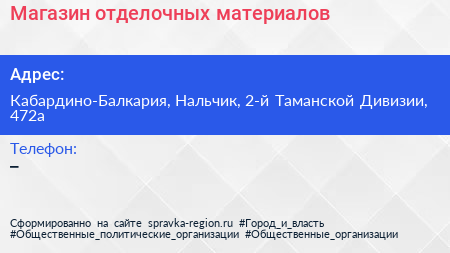 Магазин отделочных материалов по адресу Кабардино-Балкария, Нальчик, 2-й Таманской Дивизии, 472а в дальнейшем Организация, размещена в следующих категориях: