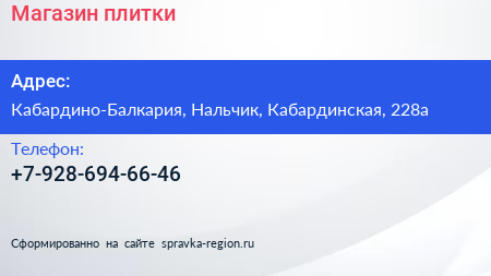 Магазин плитки по адресу Кабардино-Балкария, Нальчик, Кабардинская, 228а в дальнейшем Организация, размещена в следующих категориях:
