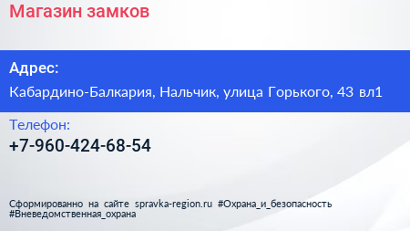Магазин замков по адресу Кабардино-Балкария, Нальчик, улица Горького, 43 вл1 в дальнейшем Организация, размещена в следующих категориях: