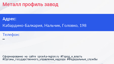 Металл профиль, завод по адресу Кабардино-Балкария, Нальчик, Головко, 198 в дальнейшем Организация, размещена в следующих категориях:
