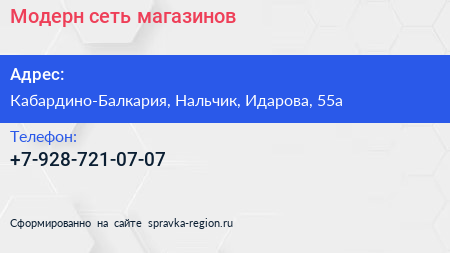 Модерн, сеть магазинов по адресу Кабардино-Балкария, Нальчик, Идарова, 55а в дальнейшем Организация, размещена в следующих категориях: