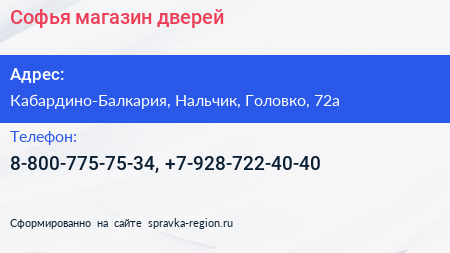 Софья, магазин дверей по адресу Кабардино-Балкария, Нальчик, Головко, 72а в дальнейшем Организация, размещена в следующих категориях:
