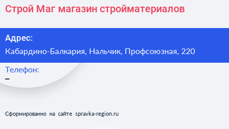 Строй Маг, магазин стройматериалов по адресу Кабардино-Балкария, Нальчик, Профсоюзная, 220 в дальнейшем Организация, размещена в следующих категориях:
