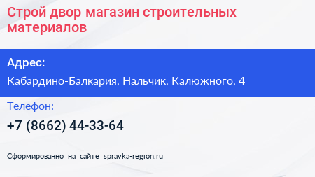 Строй двор, магазин строительных материалов по адресу Кабардино-Балкария, Нальчик, Калюжного, 4 в дальнейшем Организация, размещена в следующих категориях: