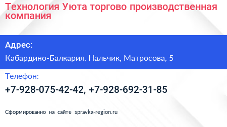 Технология Уюта, торгово-производственная компания по адресу Кабардино-Балкария, Нальчик, Матросова, 5 в дальнейшем Организация, размещена в следующих категориях: