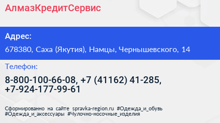 АлмазКредитСервис по адресу 678380, Саха (Якутия), Намцы, Чернышевского, 14 в дальнейшем Организация, размещена в следующих категориях: