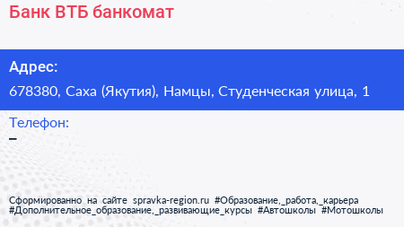 Банк ВТБ, банкомат по адресу 678380, Саха (Якутия), Намцы, Студенческая улица, 1 в дальнейшем Организация, размещена в следующих категориях: