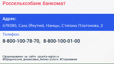 Россельхозбанк, банкомат по адресу 678380, Саха (Якутия), Намцы, Степана Платонова, 2 в дальнейшем Организация, размещена в следующих категориях: