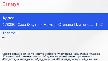 Стимул по адресу 678380, Саха (Якутия), Намцы, Степана Платонова, 1 к2 в дальнейшем Организация, размещена в следующих категориях: