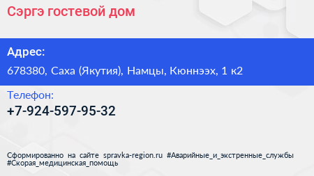 Сэргэ, гостевой дом по адресу 678380, Саха (Якутия), Намцы, Кюннээх, 1 к2 в дальнейшем Организация, размещена в следующих категориях: