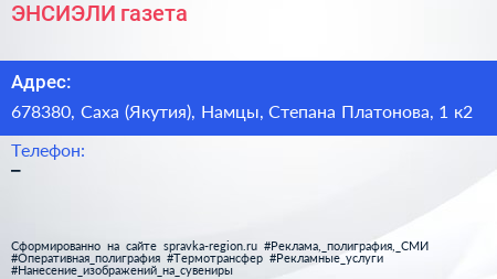 ЭНСИЭЛИ, газета по адресу 678380, Саха (Якутия), Намцы, Степана Платонова, 1 к2 в дальнейшем Организация, размещена в следующих категориях: