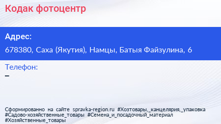Кодак, фотоцентр по адресу 678380, Саха (Якутия), Намцы, Батыя Файзулина, 6 в дальнейшем Организация, размещена в следующих категориях: