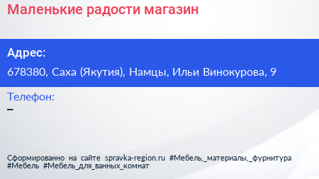 Маленькие радости, магазин по адресу 678380, Саха (Якутия), Намцы, Ильи Винокурова, 9 в дальнейшем Организация, размещена в следующих категориях: