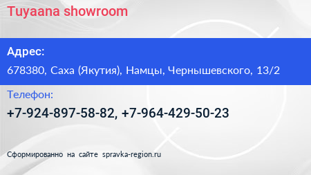 Tuyaana showroom по адресу 678380, Саха (Якутия), Намцы, Чернышевского, 13/2 в дальнейшем Организация, размещена в следующих категориях: