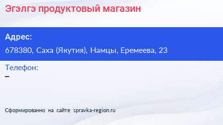 Эгэлгэ, продуктовый магазин по адресу 678380, Саха (Якутия), Намцы, Еремеева, 23 в дальнейшем Организация, размещена в следующих категориях: