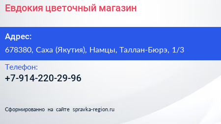 Евдокия, цветочный магазин по адресу 678380, Саха (Якутия), Намцы, Таллан-Бюрэ, 1/3 в дальнейшем Организация, размещена в следующих категориях: