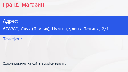 Гранд+, магазин по адресу 678380, Саха (Якутия), Намцы, улица Ленина, 2/1 в дальнейшем Организация, размещена в следующих категориях: