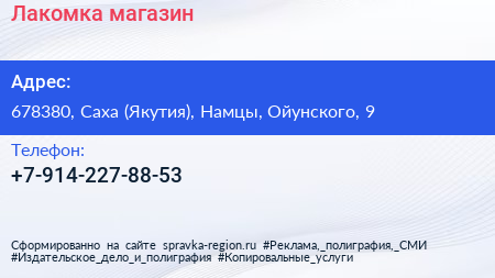 Лакомка, магазин по адресу 678380, Саха (Якутия), Намцы, Ойунского, 9 в дальнейшем Организация, размещена в следующих категориях: