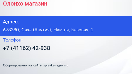 Олонхо, магазин по адресу 678380, Саха (Якутия), Намцы, Базовая, 1 в дальнейшем Организация, размещена в следующих категориях: