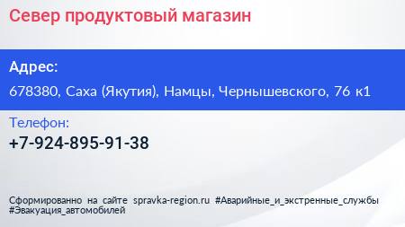 Север, продуктовый магазин по адресу 678380, Саха (Якутия), Намцы, Чернышевского, 76 к1 в дальнейшем Организация, размещена в следующих категориях: