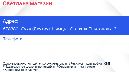 Светлана, магазин по адресу 678380, Саха (Якутия), Намцы, Степана Платонова, 3 в дальнейшем Организация, размещена в следующих категориях:
