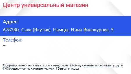 Центр, универсальный магазин по адресу 678380, Саха (Якутия), Намцы, Ильи Винокурова, 5 в дальнейшем Организация, размещена в следующих категориях:
