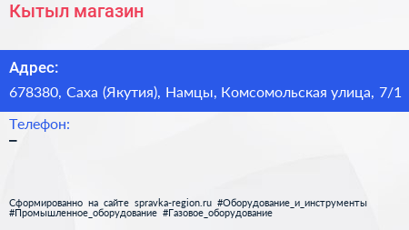 Кытыл, магазин по адресу 678380, Саха (Якутия), Намцы, Комсомольская улица, 7/1 в дальнейшем Организация, размещена в следующих категориях: