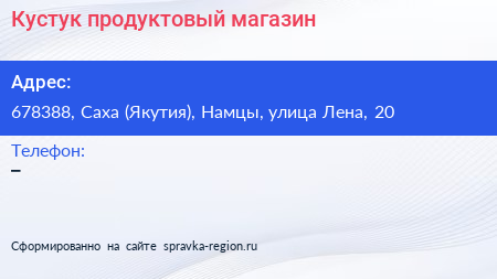 Кустук, продуктовый магазин по адресу 678388, Саха (Якутия), Намцы, улица Лена, 20 в дальнейшем Организация, размещена в следующих категориях: