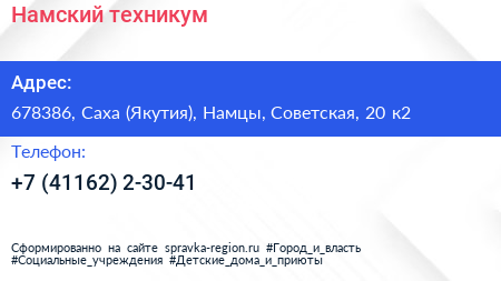 Намский техникум по адресу 678386, Саха (Якутия), Намцы, Советская, 20 к2 в дальнейшем Организация, размещена в следующих категориях: